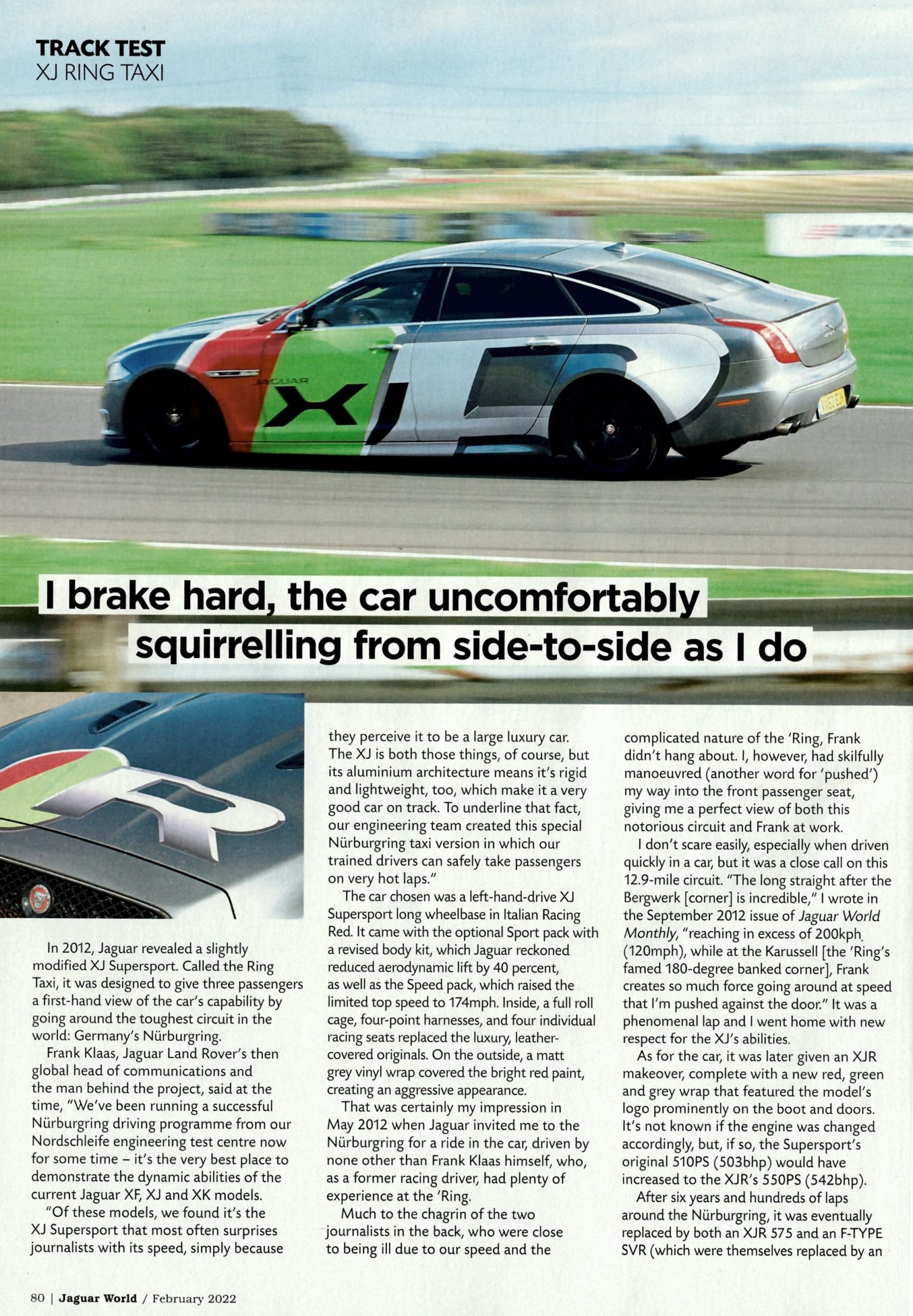 I don’t scare easily, especially when driven quickly in a car but it was a close call on this 12.9-mile circuit. “The long straight after the Bergwerk [corner] is incredible,” I wrote in the September 2012 issue of Jaguar World Monthly, “reaching in excess of 200kph (120mph), while at the Karussell [the ‘Ring’s famed 180-degree banked corner], Frank creates so much force going around at speed that I’m pushed against the door.” It was a phenomenal lap and I went home with new respect for the XJ’s abilities.